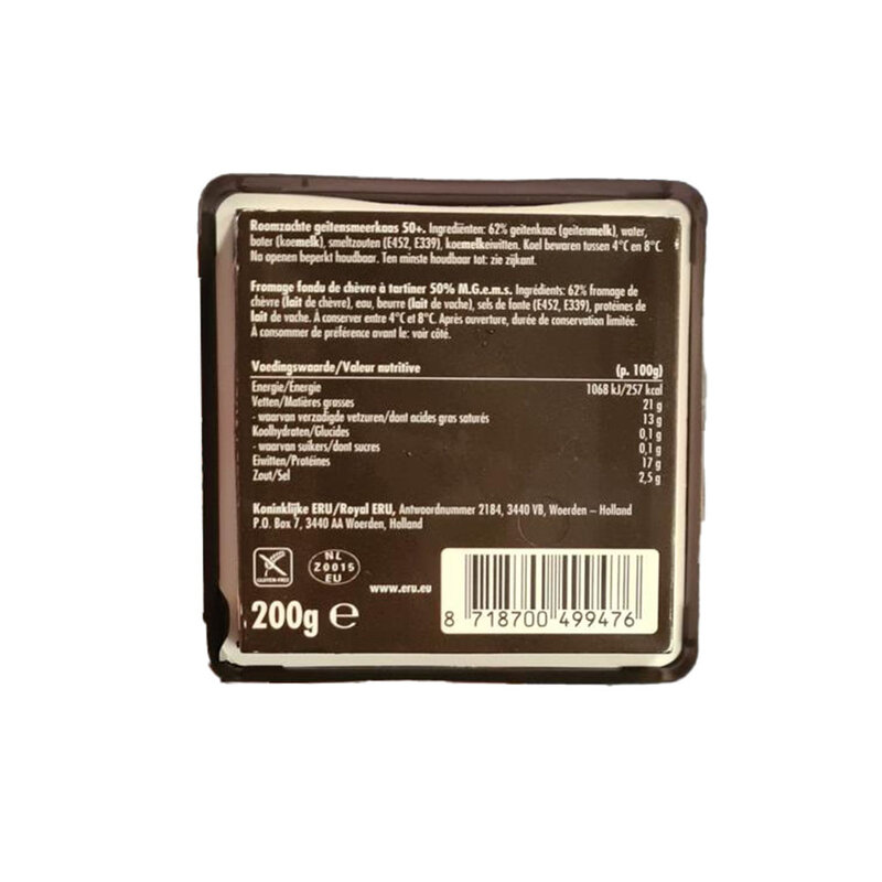 ERU Crème de Chèvre ist ein milder, cremiger Ziegen-Frischkäse mit feiner, leicht würziger Note. Dieser streichfähige Ziegenkäse wird im praktischen 200g-Becher angeboten und lässt sich dadurch einfach aufbewahren und verwenden. Perfekt für alle, die den Geschmack von Ziegenkäse lieben und dabei Wert auf Vielseitigkeit und Komfort legen.