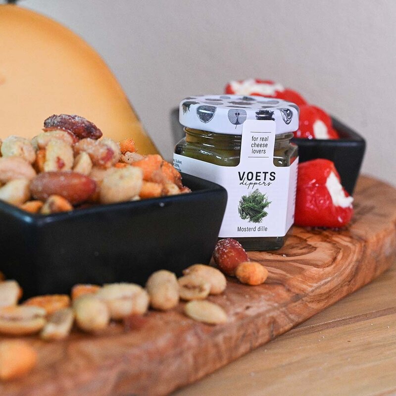 Senf-Dill-Sauce von Voets – Eine cremige Senf-Dill-Dip, die perfekt zu den Käsesorten passt. Diese geschmackvolle Sauce hebt das Snack-Erlebnis auf ein neues Niveau und macht das Käsegenuss-Erlebnis vollkommen.