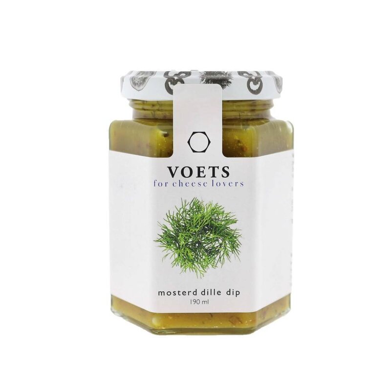 Die originale Senf-Dill-Sauce von Voets schmeckt köstlich als Käsedip. Die Senf-Dill-Sauce wird in einem 190-ml-Glas geliefert.
