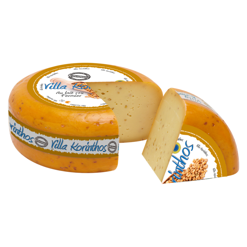 Villa Korinthos ist ein handwerklich hergestellter jung gereifter Bauernkäse, der nach traditioneller Art produziert wird. Die Zugabe von Bockshornkleesamen verleiht dem Käse eine charakteristische, leicht würzige und nussige Note. Durch seine cremige Textur und milde Reifung ist dieser Käse sowohl für Feinschmecker als auch für Liebhaber klassischer Käsesorten mit einer besonderen Note geeignet.
