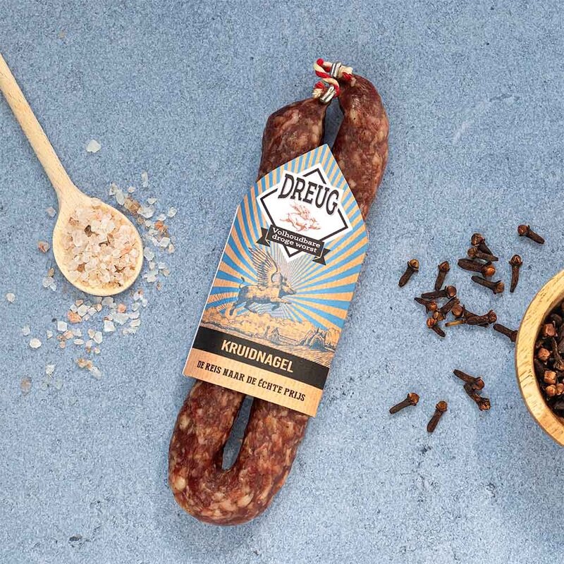 Dreug dried sausage Cloves is an artisanal dry sausage with a rich, spicy flavor thanks to the addition of cloves. Perfect as a savory snack or on your charcuterie board!