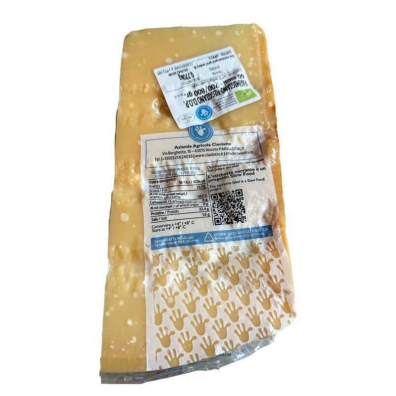 Organic Parmigiano Reggiano 60 months from Ciao Latte. Very rich in flavor, with crystals and a punch. Vacuum-packed in 700–800 g pieces, perfect for cooking or cheese boards.