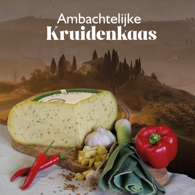 The Villa Roma is a young cheese from the farm. Matured for about 8 weeks, so still very creamy and soft in structure. This farm cheese is made with cow's milk and has an addition of various herbs and spices: Fenugreek, leek, chili, garlic, paprika and lovage! This ensures a delicious, fresh/spicy taste.