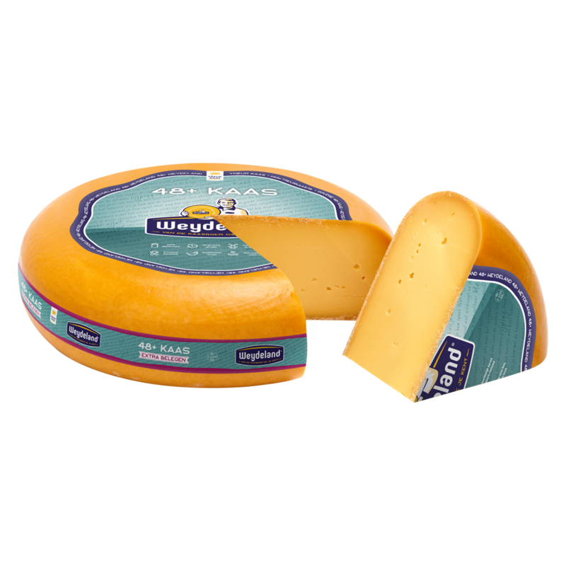 Weydeland 48+ Extra Mature cheese has matured for 6 months to form its intense flavor. This cheese has a pit, and just no crystals.