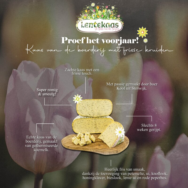 Deze veelzijdige kaas is ideaal voor op een lente kaasplank, als beleg op vers brood of als frisse toevoeging in salades. Lente Kaas is een echte must-have voor de lente en een perfect cadeau voor kaasliefhebbers.